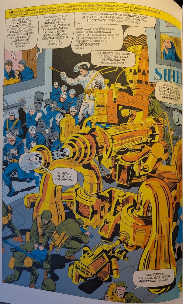 Ando leyéndome toda la espléndida Biblioteca Marvel que está editando Panini, aunque no lo estoy conservando todo (los que no me gustan los estoy revendiendo o regalando, aunque estamos llegando, al fin, al punto en el que casi todo salvo los horripilantes Vengadores y los mierdísimos X-Men, me gusta), y me he encontrado una gratísima sorpresa donde no lo esperaba: el Nick Furia Agente de SHIELD previo a la llegada de Steranko, con un montón de dibujantes menores retocando, entintando o contemplando el trabajo del maestro Kirby. Los argumentos son tan exagerados y autoconscientes y los dibujantes gozan de una libertad tan inmensa (comparado con el encorsetamiento de algunas series “grandes”, como Vengadores, que es que no te lo explicas) que facturan bellezas como esta página de ahí arriba de Kirby y Howard Purcell, que con sus diálogos demenciales y su saturación de personajes parece directamente una parodia de Will Elder para MAD.